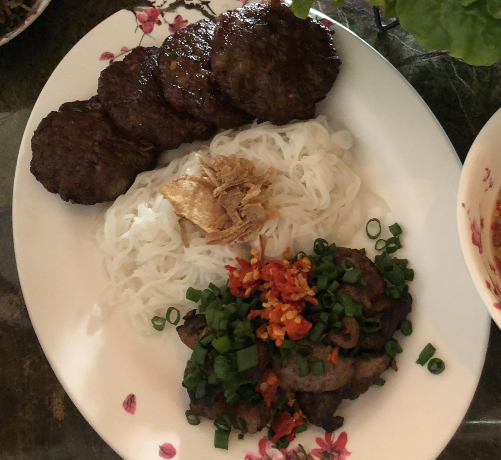 불향 가득한 고기와 완자를 호치민식 느억맘 소스에 적셔서 면과 함께 신선한 채소에 싸 먹는 깐깐 스타일의 분짜