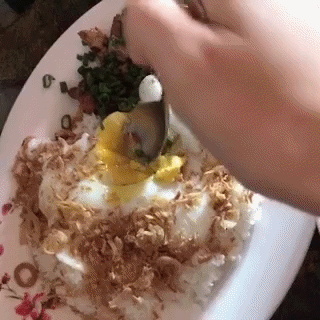 노른자를 재빠르게 비벼 밥 위에 고기 올려 한 입합니다.