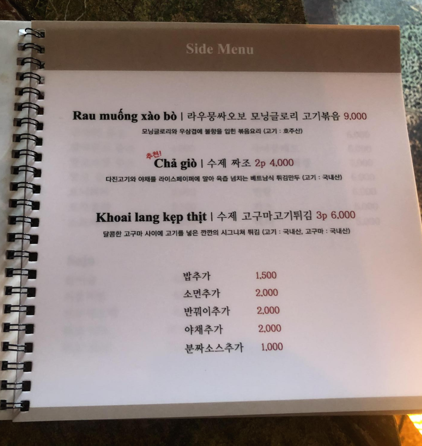 메뉴 가짓수가 많진 않지만 베트남 음식 대표적인 사이드와 메인 그리고 베트남 맥주까지 캬~~~