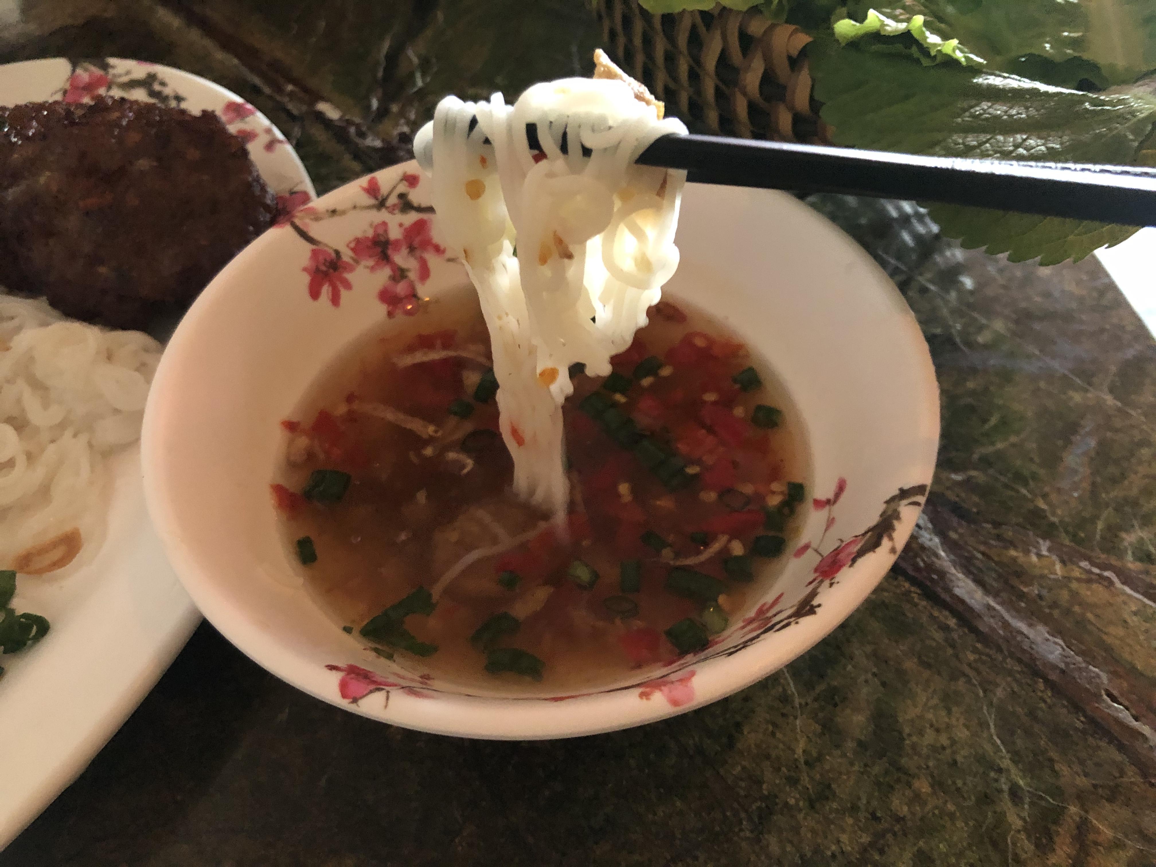 쌀국수를 짭조름한 느억맘 소스에 살~짝 찍어