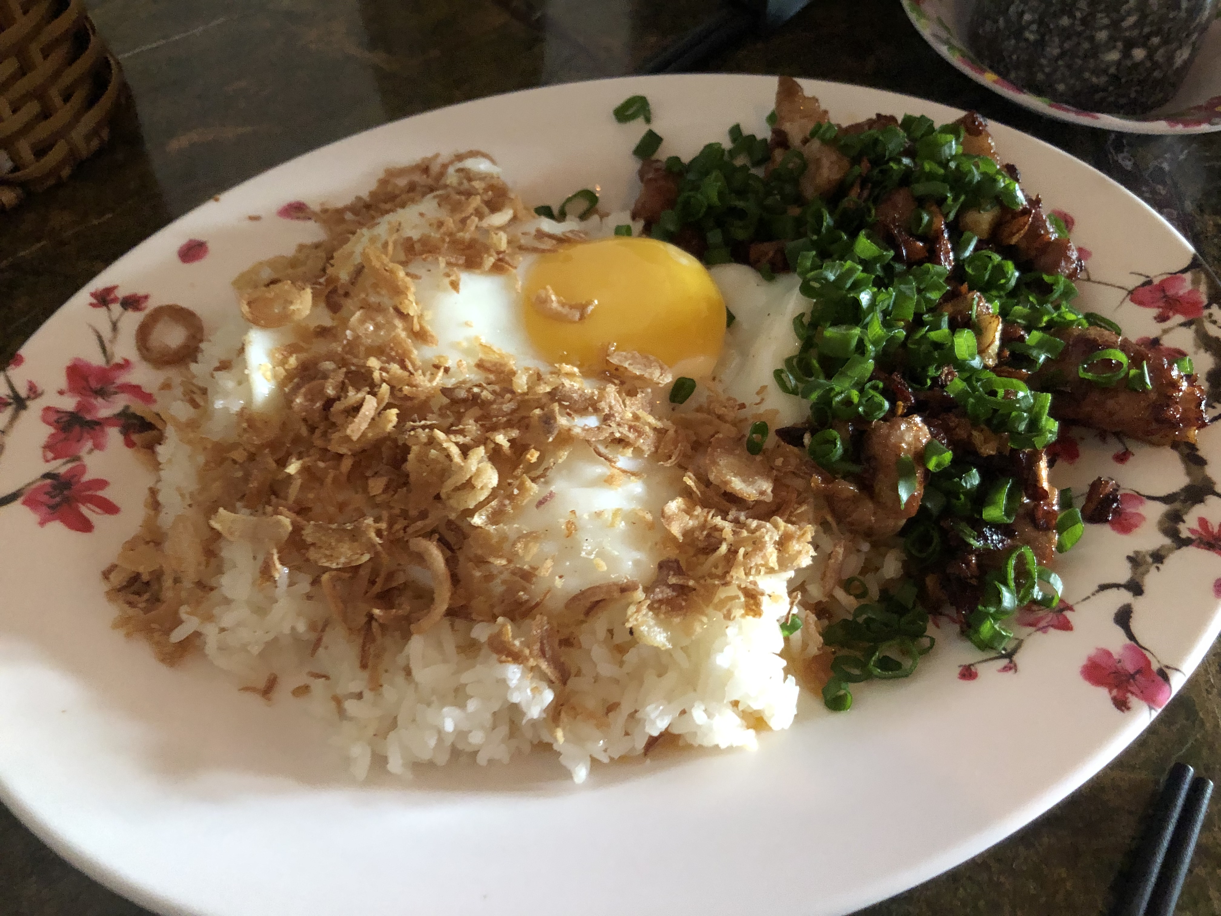 생그러운 쪽파가 올라간 숯불향 가득한 맛있는 고기, 쌀알 하나하나 살아있는 안남미, 그 위에 살아있는 반숙 계란,